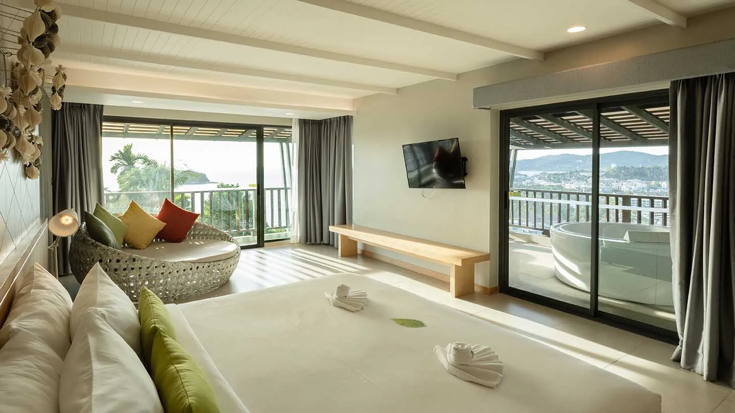 Our Canna Suite is a single space — the only one of its kind in the resort. Located on the third floor, it offers uninterrupted views of Kata Beach and the Andaman beyond. At 72 square meters, the suite is designed with simplicity and comfort in mind, featuring warm wooden accents, soft natural light, and calming tones that reflect the island’s slower rhythm.